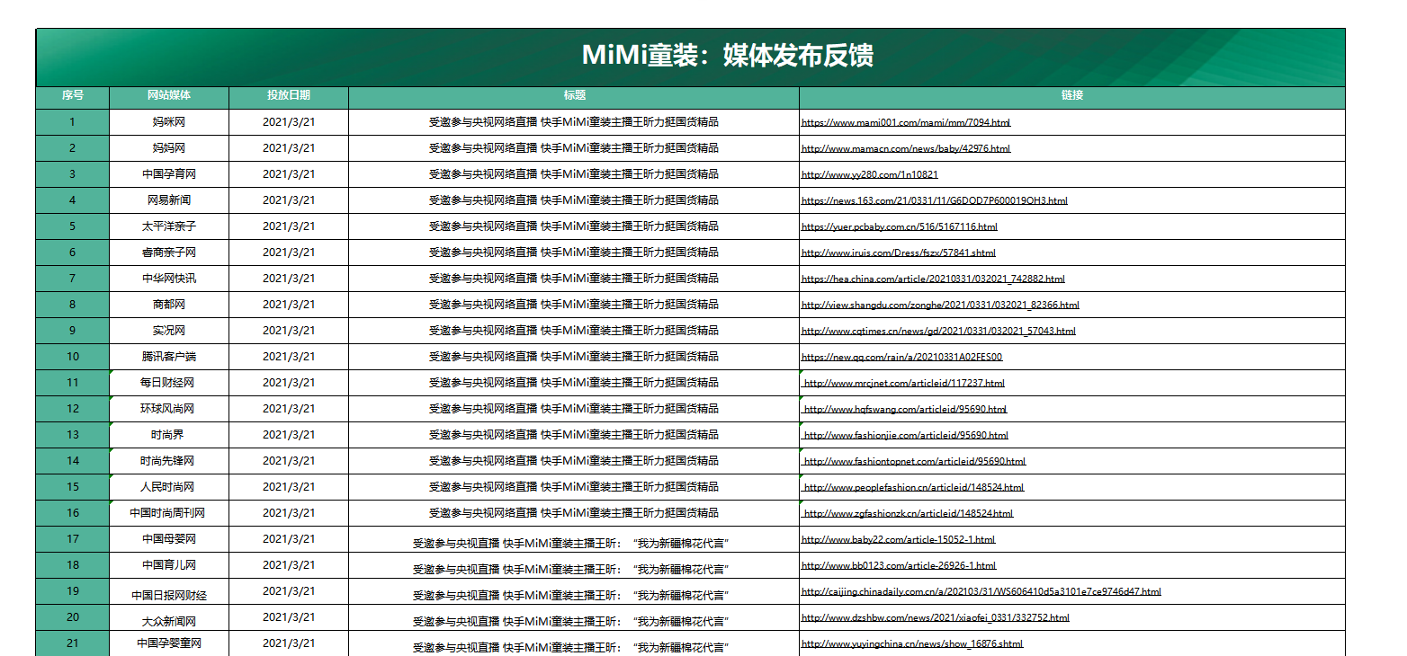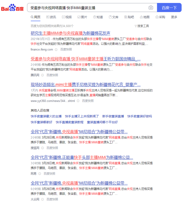- MiMi童装发布主播宣传稿件《受邀参与央视网络直播 快手MiMi童装主播王昕力挺国货精品》、《受邀参与央视直播 快手MiMi童装主播王昕:“我为新疆棉花代言”》