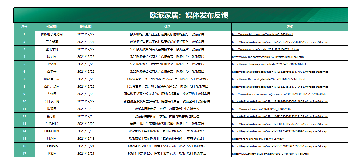- 欧派家居发布宣传稿件《欧派橱柜以更高工艺打造更优质的橱柜服务丨欧派家居》、《干湿分离多讲究,想要做好先看这6点:欧派卫浴丨欧派家居》、《揭秘全卫定制3.0,探索卫浴新机遇|欧派卫浴丨欧派家居》