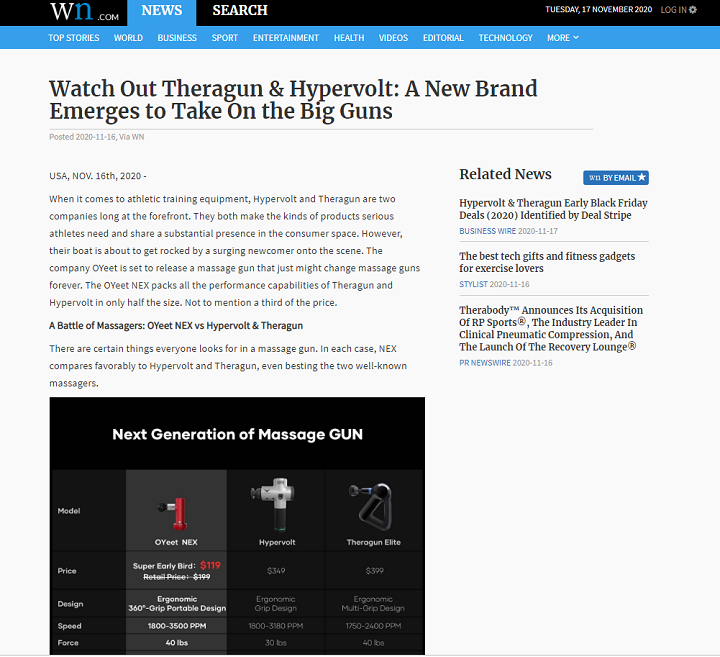 - OYeet NEX仅以一半的尺寸就包含了Theragun和Hypervolt的所有性能,并且以前面两家价格的三分之一进入市场,计划击败两个著名的按摩器品牌——Hypervolt和Theragun。